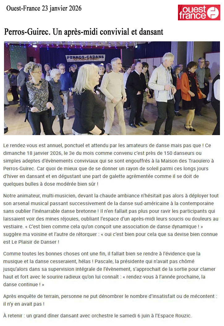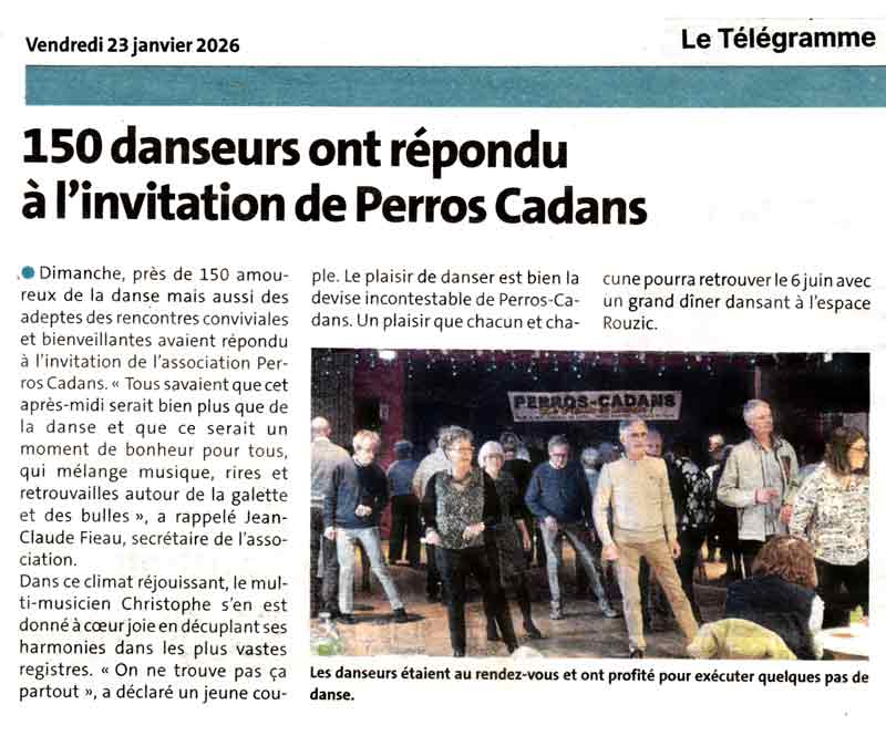 Les partenaires qui voudraient soutenir notre Association sont les bienvenus ! GALETTE DU 18 JANVIER 2026 31ème ASSEMBLÉE GENERALE DU 22 MARS 2025 GALETTE DU 21 JANVIER 2024 ELECTION DE LA 8ème PRESIDENTE 29ème ASSEMBLÉE GENERALE DU 1er AVRIL 2023 28ème ASSEMBLÉE GENERALE DU 8 OCTOBRE 2020 LE TELETHON 2019 LE 7 DECEMBRE A LA MAISON DES TRAOUÏERO STAGE AVEC D. & C. AVENEL LES 16 et 17 NOVEMBRE 2019 STAGE AVEC JACQUELINE ARMAND LE 27 AVRIL 2019 ASSEMBLÉE GENERALE DU SAMEDI 6 AVRIL 2019 STAGE AVEC D. & C. AVENEL LES 17 et 18 NOVEMBRE 2018 DISTINCTION AU COFONDATEUR DE PERROS-CADANS TAP DANSES AU COLLEGE DES SEPT ÎLES RECHERCHE D'ENSEIGNANTS SOIRÉE FIN DE COURS DE LA SAISON 2017/2018 ASSEMBLÉE GENERALE DU SAMEDI 17 MARS 2018 ANIMATION AUX JARDINS D'ARCADIE LE 8 JFEVRIER 2018 GALETTE DU 21 JANVIER 2018 STAGE AVEC D. & C. AVENEL LES 25 et 26 NOVEMBRE 2017 PERROS-CADANS FÊTE SES 25 ANS ASSEMBLÉE GENERALE DU SAMEDI 1er AVRIL 2017 LES COURS AU COLLEGE POUR LA SAISON 2016/2017 STAGE AVEC D. & C. AVENEL LES 19 et 20 NOVEMBRE 2016 RENTREE 2016/2017 ELECTION D'UNE PRESIDENTE ASSEMBLÉE GENERALE DU SAMEDI 12 MARS 2016 STAGE AVEC D. & C. AVENEL LES 6 et 6 NOVEMBRE 2015 ASSEMBLÉE GENERALE DU SAMEDI 28 MARS 2015 GALETTE DU 18 JANVIER 2015 STAGE AVEC D. & C. AVENEL LES 29 et 30 NOVEMBRE 2014 STAGE AVEC JACQUELINE ARMAND LE 8 NOVEMBRE 2014 ASSEMBLÉE GENERALE DU SAMEDI 29 MARS 2014 GALETTE DU 19 JANVIER 2014 STAGE AVEC D. & C. AVENEL LES 16 et 17 NOVEMBRE 2013 RENTREE 2013/2014 ELECTION D'UN NOUVEAU BUREAU ASSEMBLÉE GENERALE DU SAMEDI 23 MARS 2013 GALETTE DU 13 JANVIER 2013 STAGE AVEC D. & C. AVENEL LES 6 et 7 OCTOBRE 2012 DINER DANSANT du 20ème ANNIVERSAIRE LE 2 JUIN 2012 20ème ANNIVERSAIRE DE PERROS-CADANS ASSEMBLÉE GENERALE DU SAMEDI 24 MARS 2012 GALETTE DU 15 JANVIER 2012 STAGE DES ADHERENTS AVEC JACQUELINE ARMAND LE 7 JANVIER 2012 TELETHON DU 3 DECEMBRE 2011 FIN DE COURS DU 16 JUIN 2011 STAGE DE TANGO ARGENTIN AVEC P. L'HOSTIS LES 14 et 15 MAI 2011 ASSEMBLÉE GENERALE DU SAMEDI 26 MARS 2011 STAGE DE TANGO ARGENTIN AVEC P. L'HOSTIS LES 19 et 20 FEVRIER 2011 GALETTE DU 16 JANVIER 2011 STAGE DES ADHERENTS AVEC JACQUELINE ARMAND LE 6 NOVEMBRE 2010 THE DANSANT AU BOWLING LES HAUBANS des 23 MAI et 6 JUIN 2010 ASSEMBLÉE GENERALE DU SAMEDI 20 MARS 2010 GALETTE DU 17 JANVIER 2010 FIN DE COURS DU 11 JUIN 2009 ASSEMBLÉE GENERALE DU SAMEDI 7 MARS 2009 TELETHON 2008 STAGE DES ADHERENTS AVEC JACQUELINE ARMAND LE 15 NOVEMBRE 2008 ASSEMBLÉE GENERALE DU SAMEDI 15 MARS 2008 GALETTE DU 13 JANVIER 2008 STAGE DES ADHERENTS AVEC D. & C. AVENEL LES 1 et 2 DECEMBRE 2007 STAGE AVEC JACQUELINE ARMAND DU 13 OCTOBRE 2007 LA RENTRÉE 2007/2008 ASSEMBLÉE GENERALE DU SAMEDI 24 MARS 2007 STAGE DE ROCK SWING AVEC CHRISTOPHE ET ALEXIA LE 4 FEVRIER 2007 GALETTE DU 14 JANVIER 2007 THE DANSANT DU TELETHON TREGASTEL 2006 LE 3 DECEMBRE STAGE AVEC JACQUELINE ARMAND DU 7 OCTOBRE 2006 LA RENTRÉE 2006/2007 ASSEMBLÉE GENERALE DU SAMEDI 18 MARS 2006 THE DANSANT DES AMIS DE KOUSSANE LE 12 MARS 2006 STAGE DE LINDY ET BALBOA AVEC CHRISTOPHE ET ALEXIA LE 12 FEVRIER 2006 STAGE DES ADHERENTS AVEC D. & C. AVENEL LES 19 & 20 NOVEMBRE 2005 THE DANSANT DU TELETHON TREGASTEL 2005 LE 13 NOVEMBRE STAGE DE SALSA DU 1er OCTOBRE 2005 AVEC RODRIGUE ROMAIN LA RENTRÉE 2005/2006 THE DANSANT DES AMIS DE KOUSSANE LE 13 MARS 2005 ASSEMBLÉE GENERALE DU SAMEDI 5 MARS 2005 GALETTE DES ROIS DU DIMANCHE 16 JANVIER 2005 LA RENTRÉE 2004/2005 STAGE DES 24 ET 25 AVRIL 2004 AVEC DANIEL ET CATHY AVENEL ANIMATION AU FOYER-LOGEMENTS LE 13 MARS 2004 ASSEMBLÉE GENERALE DU SAMEDI 6 MARS 2004 GALETTE DES ROIS DU DIMANCHE 11 JANVIER 2004 STAGE DES 29 ET 30 NOVEMBRE 2003 AVEC DANIEL ET CATHY AVENEL LA RENTRÉE 2003/2004 ASSEMBLÉE GENERALE SAMEDI 23 FÉVRIER 2003 STAGE DES 8 ET 9 FÉVRIER 2003 AVEC DANIEL ET CATHY AVENEL GALETTE DES ROIS DU DIMANCHE 19 JANVIER 2003 ÉCHOS DU 1er TRIMESTRE DE LA SAISON 2002/2003 |